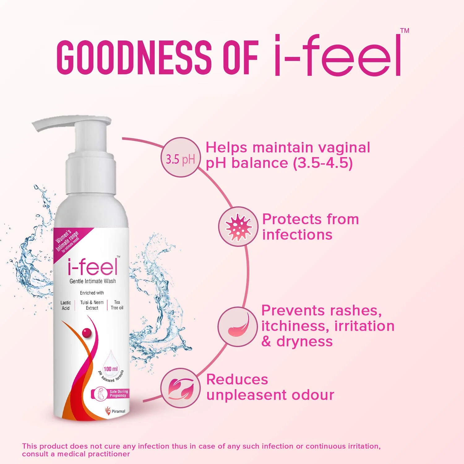 i-feel Gentle Intimate wash is enriched with Tea Tree Oil (helps keep infections away), Neem, Tulsi & Aloe vera Extracts (maintains healthy vaginal flora).
